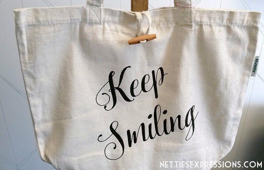 This bag is customized with black heat transfer vinyl. The vinyl is applied with a commercial heat press.