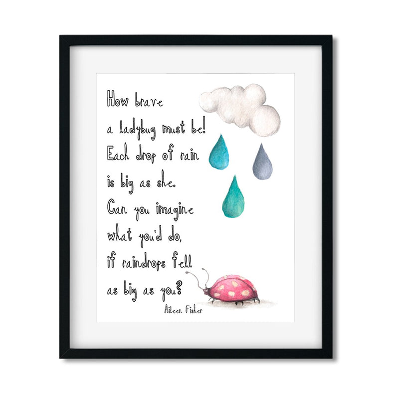 How brave a ladybug must be! Each drop of rain is big as she. Can you imagine what you'd do, If raindrops fell as big as you? - Aileen Fisher