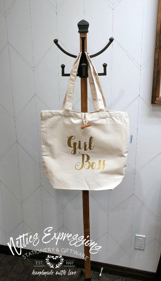 This bag is customized with gold metallic heat transfer vinyl. The vinyl is applied with a commercial heat press.