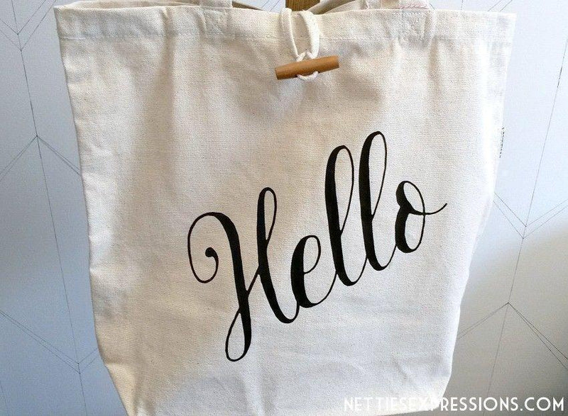 This bag is customized with black heat transfer vinyl. The vinyl is applied with a commercial heat press.