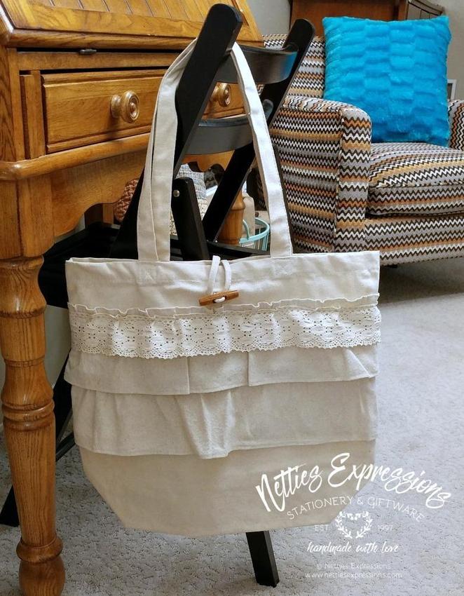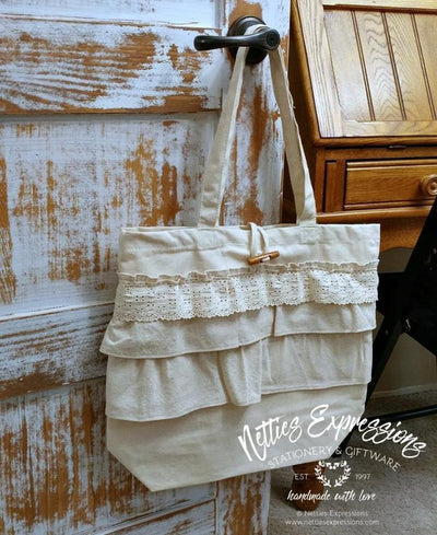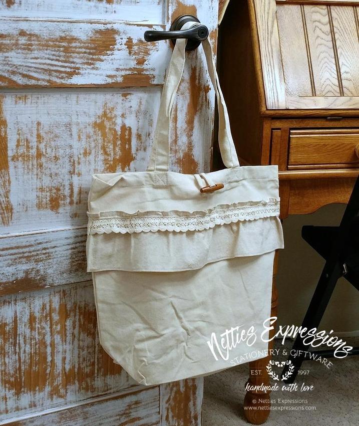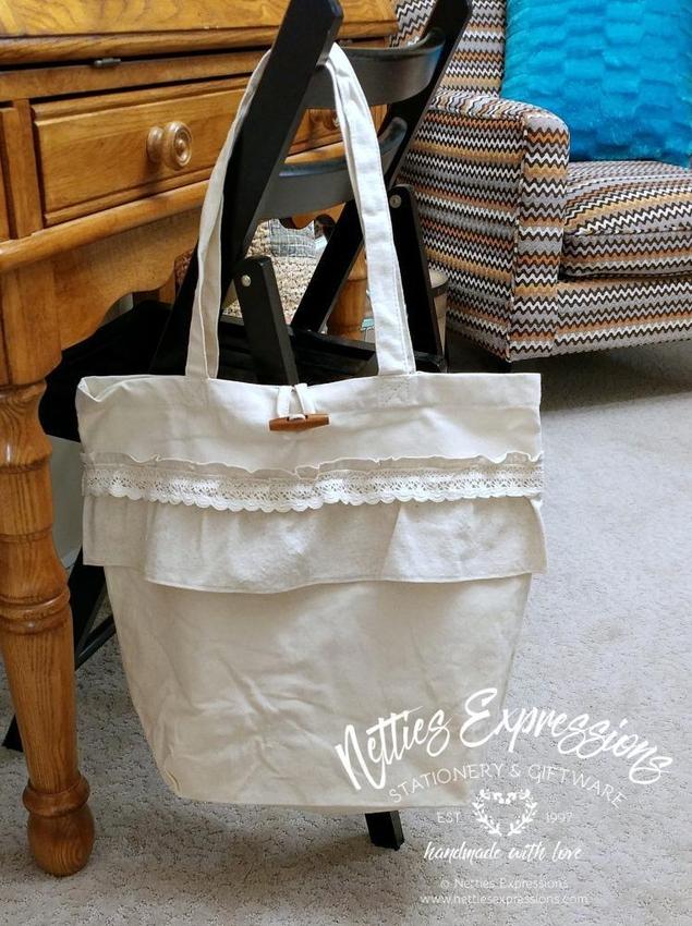 The bag closes with a stylish and eco-friendly wooden toggle. This bag is customized with cotton ruffles and cotton lace.