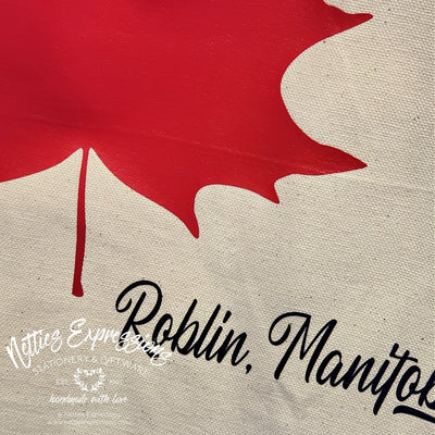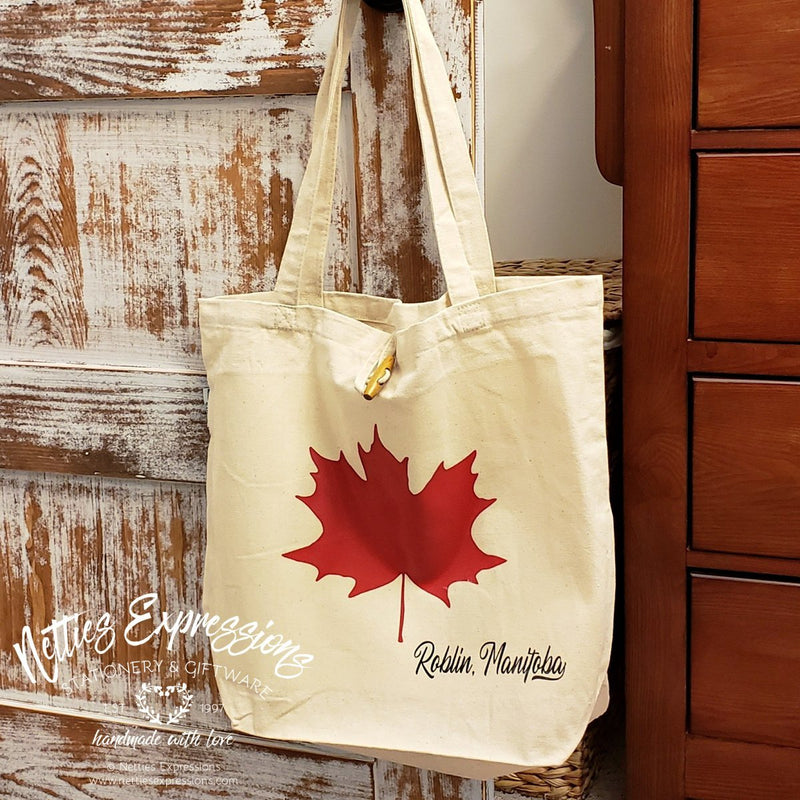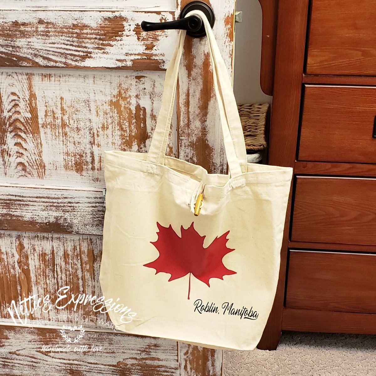 The bag closes with a stylish and eco-friendly wooden toggle.This bag is customized with black heat transfer vinyl. The vinyl is applied with a commercial heat press.
