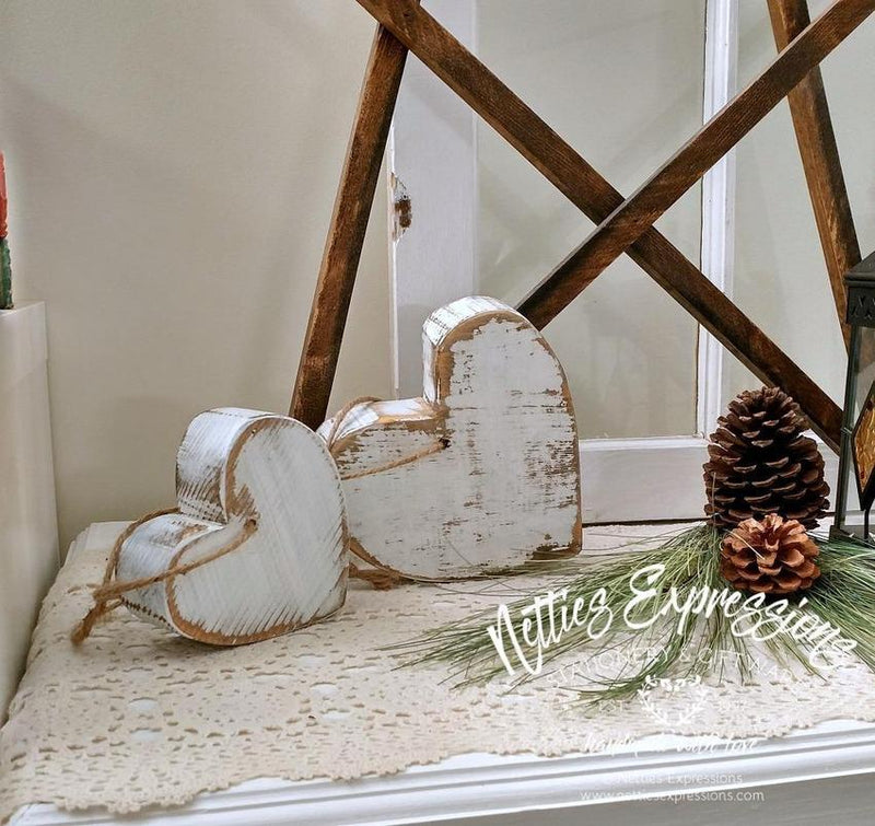 This chunky wooden heart is made from a 2" x 10". This is painted, distressed and finished with a wood sealer. Netties Expressions wooden houses are painted with Fusion Mineral Paint. The hearts are then sealed with Beauti-Tone Acrylic Clear Lacquer.