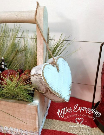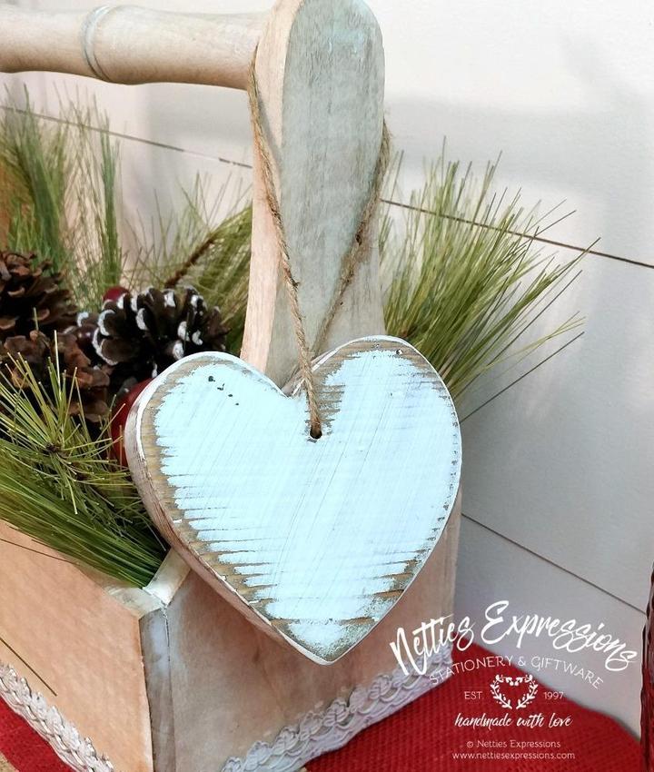 This chunky wooden heart is made from a 2" x 10". This is painted, distressed and finished with a wood sealer. Netties Expressions wooden houses are painted and then sealed with Beauti-Tone Acrylic Clear Lacquer.