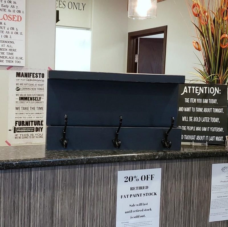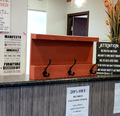 This wooden box is made from a combination of rough lumber and pine. This cubby is painted with FAT Paint and then sealed with Beauti-Tone Acrylic Clear Lacquer.