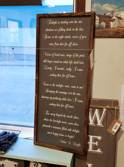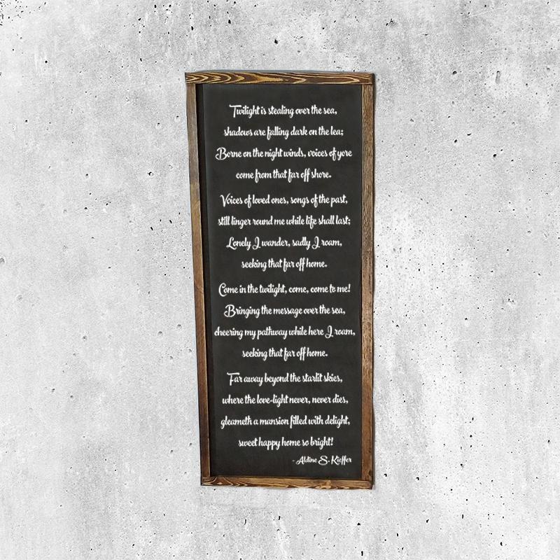 Twilight is stealing over the sea, shadows are falling dark on the lea; Borne on the night winds, voices of yore come from that far off shore. Voices of loved ones, songs of the past, still linger round me while life shall last; Lonely I wander, sadly I roam, seeking that far off home. Come in the twilight, come, come to me! Bringing the message over the sea, cheering my pathway while here I roam, seeking that far off home. Far away beyond the starlit skies, where the love-light never, never dies, gleameth a mansion filled with delight, sweet happy home so bright! - Aldine S. Kieffer