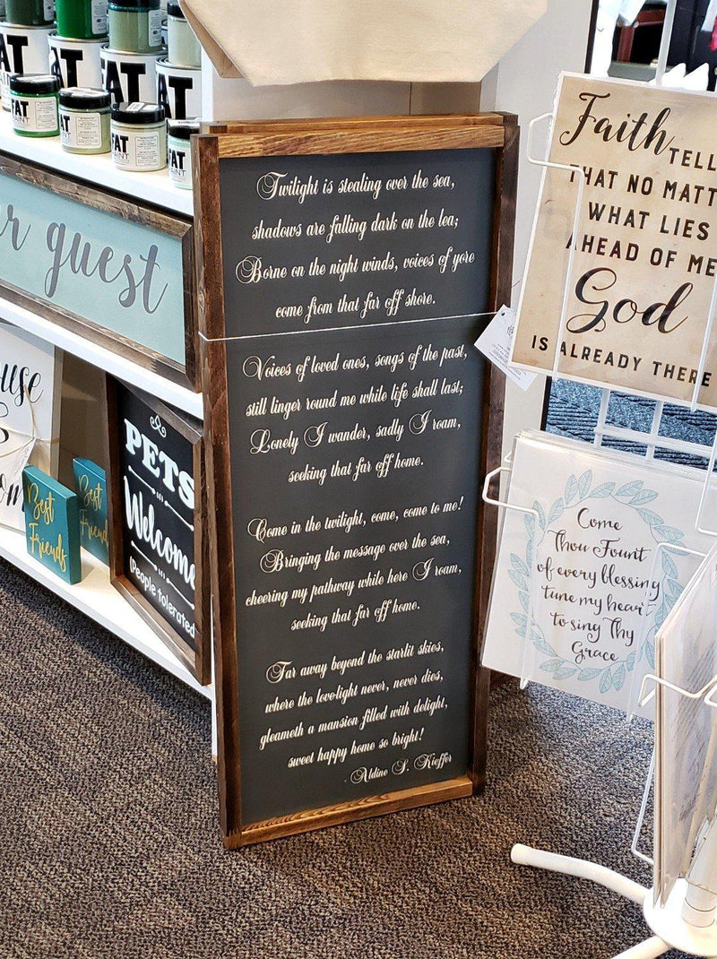 This handmade rustic wooden framed sign is made from 3/4" GIS (good-one-side plywood) and measures approximately 12"W X 30"L X 0.75"D. The frame is 0.5" wide and adds 0.5" on to each side of the sign.