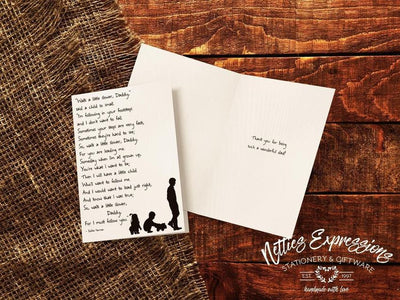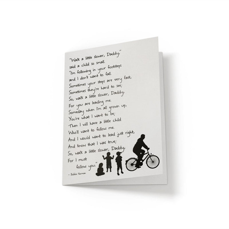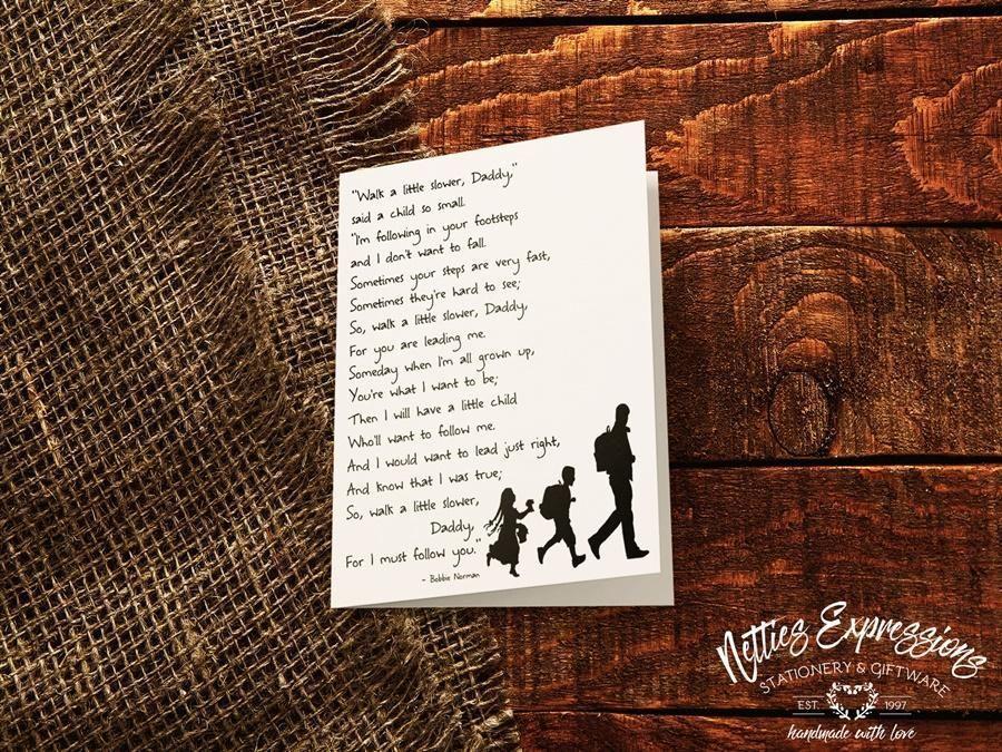 "Walk a little slower, Daddy," said a child so small. "I'm following in your footsteps and I don't want to fall. Sometimes your steps are very fast, Sometimes they're hard to see; So, walk a little slower, Daddy, For you are leading me. Someday when I'm all grown up, You're what I want to be; Then I will have a little child Who'll want to follow me. And I would want to lead just right, And know that I was true; So, walk a little slower, Daddy, For I must follow you." - Bobbie Norman